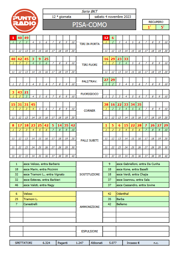Buonasera, tutto pronto per Pisa-Como, match valido per la 12a giornata di serie B. Squadre in campo, Pisa in nerazzurro. Prima dell'inizio del match un minuto di silenzio per le vittime dell'alluvione. Partiti! Pisa che attaccherà sotto la Curva Nord. Raggiunto e superato il 5' di gioco. Al 6' Veloso, in ritardo in mediana, si prende il primo giallo del match. Dopo 8' minuti sono segnalati all'esterno dello stadio ancora molti tifosi, sembra per i ritardi accumulati ai tornelli, dato che Curva Nord e gradinata entrano dallo stesso accesso. Non gioca male il Pisa, che comunque, come spesso in stagione, non riesce a far male negli ultimi metri. Siamo al 12'. Gol Como al 13', niente da fare per i nerazzurri. Verdi da destra serve Cutrone in area e semirovesciata che non lascia scampo a Nicolas. Como 1, Pisa 0. Prova a rispondere il Pisa, angolo da destra conquistato al 15' per un nulla di fatto. Pisa contestato in campo dagli spalti, società contestata dalla Curva Nord per il caro biglietti e la situazione Arena Garibaldi. Siamo al 20'. Ammonito Tramoni al 25'. Ci prova ancora Cutrone al 29': destro da fuori area sul fondo di poco. Dopo mezz'ora ancora nessun tiro in porta dei nerazzurri. Secondo corner Pisa al 30': batte Veloso da destra e nuovo angolo dall'altra parte. Veloso al 31' e Como che ribatte senza troppe apprensioni. Meno di dieci minuti alla fine del primo tempo. Pisa incapace di fare male, Como avanti con merito, anche se protagonista di una partita senza squilli. Angolo Como al 38'. Occasionissima Pisa al 40' e Valoti, servito al bacio da Estevs all'altezza del rigore (su assist di Marin) , calcia di destro alto sopra la traversa. Ancora un gol mangiato dai nerazzurri. Bella azione corale a destra. Conclusione da dimenticare. Ammonito Odenthal al 42'. Punizione interessante da poco oltre limite per i nerazzurri: batte Veloso e palla fuori di poco. Pisa che spinge nel finale. Angolo Pisa al 45': va Veloso per un nulla di fatto, Valoti di testa mette fuori. Un minuto di recupero. Finisce così, squadre al riposo sul minimo scarto.
