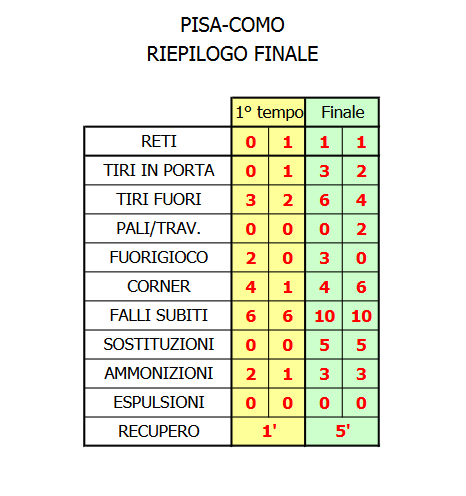 Squadre nuovamente in campo per la ripresa. Nel Pisa Barberis per Veloso, mentre sull'Arena cade la pioggia. Partiti! Gooollll Pisa, suvito pari con Valoti al 1' su assist di Mlakar. Ancora occasione Pisa al 3', Mlakar a sinistra, su assit di Marin, incrocia in mezzo per nessun compagno. Peccato. Sono partiti fortissimo i nerazzurri, ma occasione Como al 5': su ripartenza iniziata con un fallo su Tramoni non fischiato. Nicolas risponde presente a Cutrone. Secondo fallo non fischiato su un nerazzurro, riparte il Como e ammonito ingiustamente Canestrelli. Ora tifo nerazzurro che se la prende con l'arbitro. Occasione Pisa con Tramoni: esterno della rete al 9'. Nel Como al 9': Da Cunha subentra a Gabrielloni. Angolo Como al 16': la difesa nerazzurra libera. Nel Como al 17': Baselli per Kone e Chajia per Verdi. Nel Pisa Piccinini subentra a Marin. Ancora bene il Pisa a sinistra al 21', il Como si salva in extremis. Corner Como al 22': da sinistra palla in mezzo libera la difesa nerazzurra. Occasionissima Pisa al 25': ancora Valoti, ancora dall'altezza del dischetto del rigore su assist da destra di Tramoni. Girata di prima intenzione fuori di un soffio. Peccato. Occasionissima Como al 28': Cutrone servito in area, pallonetto sull'uscita di Nicolas e traversa superiore per un nulla di fatto. Ancora Como e palo esterno di Chajia dalla distanza al 29'. Raggiunta la mezz'ora e dopo l'ottimo inizio del Pisa, batte due colpi il Como. Match vivo e apertissimo. Doppio cambio Pisa al 32': fuori Esteves e Tramoni per Barbieri e Vignato. Doppio angolo Como al 34': sul secondo da sinistra battuto da Da Cunha libera la difesa. Ancora un corner per gli ospiti al 35'. Ammonito l'ex Barba. Meno di dieci minuti più recupero alla fine del match. Nel Como al 37' fuori Cassandro e Ioannou per Iovine e Sala. Siamo al 39'. Occasionissima Pisa al 40' con Piccinini, a tu per tu con il portiere che para, poi nessuno riesce a ribattere a rete. Peccato. Ancora occasione Pisa al 43' sugli sviluppi di una punizione, la difesa ospite si salva in qualche modo. Cinque minuti di recupero. Nel Pisa al 46' fuori Valoti, dentro Nagy. Occasionissima Pisa al 49': Vignato sfonda e destro parato dal portire, peccato. Finisce così, Pisa e Como impattano 1 a 1.