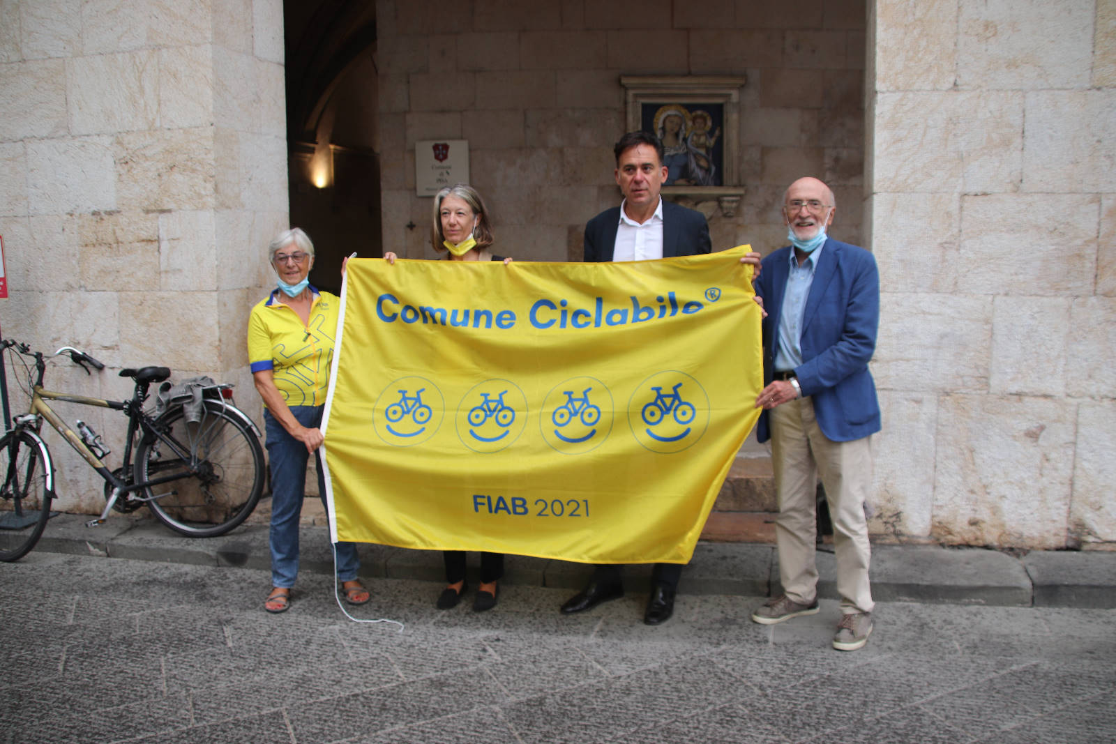 Pisa si conferma Comune Ciclabile e ottiene da parte di FIAB il riconoscimento di 4 bike-smile su un massimo di 5. Comuni Ciclabili è il riconoscimento della Federazione Italiana Ambiente e Bicicletta, che valuta e attesta il grado di ciclabilità dei comuni italiani, accompagnandoli in un percorso virtuoso verso politiche bike friendly. L’iniziativa, che fino ad oggi ha coinvolto oltre 140 comuni italiani, ha ottenuto per il 2021 il patrocino del Ministero delle Infrastrutture e dei Trasporti e del Ministero dell’Ambiente. Stamani, giovedì 16 settembre, in piazza XX Settembre si è svolta la consegna al Comune di Pisa della bandiera bike-smile da parte dei rappresentanti della FIAB Pisa. A ricevere l’importante riconoscimento il sindaco Michele Conti e l’assessore alla mobilità e urbanistica Massimo Dringoli. «Il riconoscimento ricevuto come Comune Ciclabile da FIAB, che ringrazio per la collaborazione e il confronto costante, ci riempie di soddisfazione e ci stimola a proseguire negli investimenti per lo sviluppo della mobilità dolce, commenta il sindaco di Pisa Michele Conti. Per promuovere l’utilizzo della bicicletta, primo compito di un’Amministrazione è sicuramente realizzare una rete di piste ciclabili più estesa possibile, in cui i ciclisti si possano muovere in sicurezza, dotata di attraversamenti ciclopedonali segnalati e collegata in tutti i suoi tratti. Ad oggi la rete totale cittadina raggiunge i 125 km e il Piano Urbano per la Mobilità Sostenibile prevede di proseguire con nuovi tracciati in tutta la città. Con il reperimento dei finanziamenti ministeriali da poco ottenuti, andremo a realizzare a breve tre nuovi tratti di piste ciclabili: quello di via Bonanno, dal Ponte della Cittadella fino a piazza Manin, finanziata per promuovere le ciclovie dalla Stazione verso i poli universitari, la ciclopista di via Zamenhof, che metterà in collegamento piazza delle Gondole con la pista ciclabile lungo le mura, e la bretella che metterà in collegamento la Ciclopista del Trammino con la Basilica di San Piero Grado».