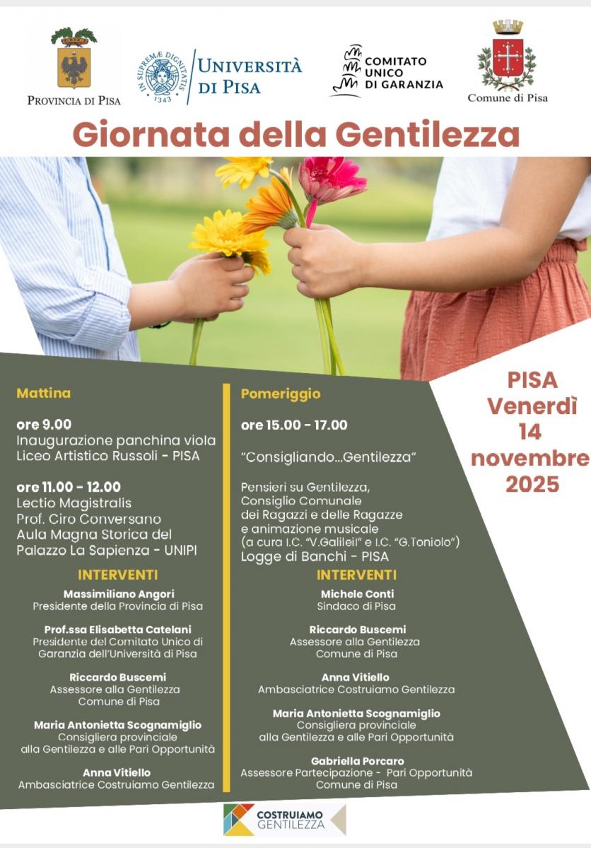 Si celebra venerdì 14 novembre a Pisa la Giornata della Gentilezza, promossa dalla Provincia di Pisa, dal Comitato Unico di Garanzia dell’Università e dal Comune.