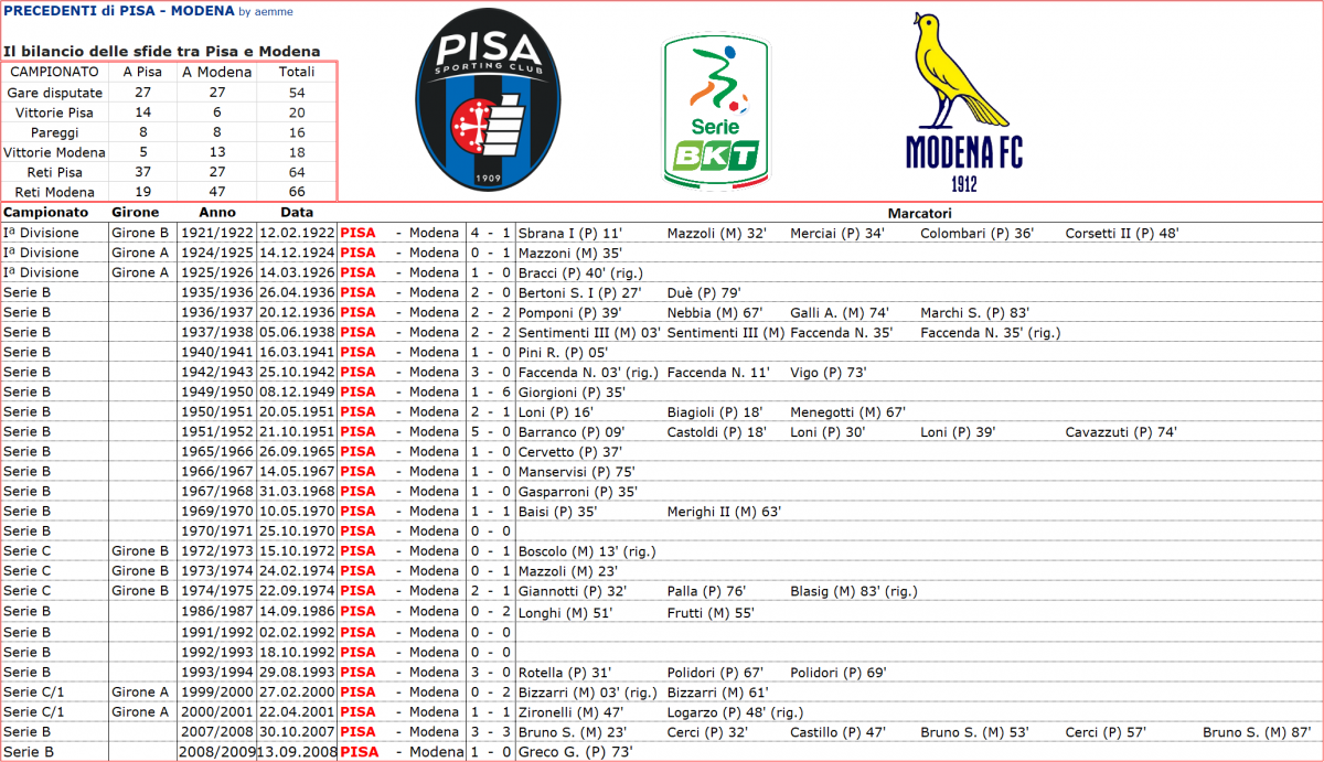 All’Arena si è giocato ben 27 volte con 14 vittorie del Pisa, 8 pareggi e 5 sconfitte. La storia delle sfide con i canarini risale addirittura al 1921, ma adesso erano 14 anni che le due squadre non si affrontavano. Nell’ultimo precedente ebbe la meglio il Pisa grazie ad una rete di Greco su rigore. Dei corsi e ricorsi storici frale due squadre ne parla diffusamente anche la puntata di questa settimana de “Il Chiavacci racconta il Pisa” che potrete riascoltare su Spotify, canale PuntoRadioFM.
