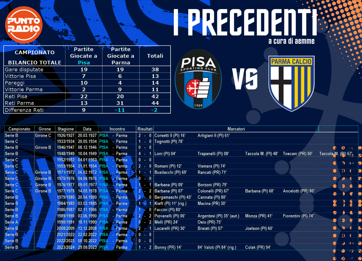 Diciannove i precedenti fra le due squadre all’Arena Garibaldi, la prima sfida, vinta dal Pisa, risale addirittura al 1927. In totale i nerazzurri hanno vinto 7 volte, l’ultima nel 2007 2-1 con reti di Braiati e Joelson, pareggiato 10 ed alzato bandiera bianca in due occasioni, compresa l’ultima volta che le due squadre si sono affrontate: il 29 agosto 2024 finì 2-1 per i crociati che trovaro il goal partita al quarto minuto di recupero.