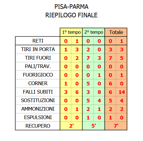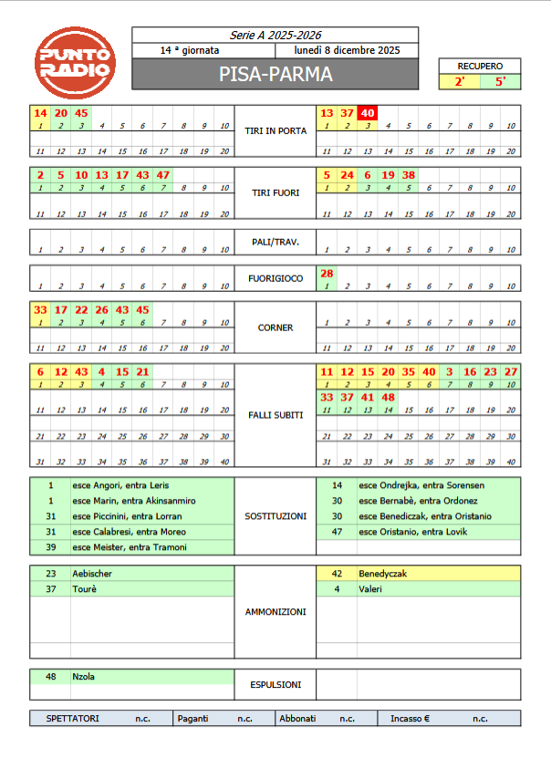 Buonasera, tutto pronto per Pisa-Parma, match valido per la 14a giornata di serie A. Squadre in campo, Pisa in maglia nerazzurra e che attaccherà sotto la Curva Sud. Partiti! Primi cinque minuti di gara senza emozioni, squadre chiuse e molto attente. Siamo al 7'. Occasione Parma al 13': Scuffet dice no a Benedyczak. Riparte il Pisa (14') e occasione per i nerazzurri: il portiere blocca senza problemi il colpo di testa sotto porta di Touré. Al 17' gioco fermo per l'infortunio a Valenti. Si riprende al 18'. Accade poco, match che resta in equilibrio, ancora poche emozioni. Siamo al 21'. Al 27' nerazzurri avanti, da qualche minuto Pisa in pressione senza la capacità di sfondare. Raggiunta e superata la mezz'ora. Siamo al 32'. Angolo Pisa al 33': da destra va Angori (34') per un nulla di fatto. Occasione Parma al 37': Britschgi impegna severamente Scuffet dalla lunga, la palla, deviata da Caracciolo con un braccio, per poco non beffa il portiere nerazzurro che salva d'istinto. Controllo Var in corso per un possibile rigore per il Parma. L'arbitro va a rivederla. Rigore per il Parma al 39'. Sul dischetto al 40' Benedyczak e 1 a 0 ospite. Ammonito Benedyczak per l'esultanza. Punizione da sinistra Pisa al 43': sul punto Aebischer, ribatte la difesa. Meno di un minuto più recupero alla fine. Pisa poco propenso ad attaccare e punito dal rigore ducale. 2 minuti di recupero. Finisce così, squadre al riposo sul minimo scarto.