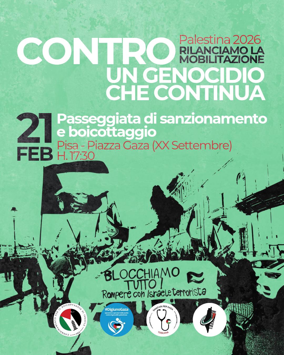 La manifestazione si terrà sabato 21 febbraio alle ore 17.30 in Piazza Gaza (XX settembre) a Pisa