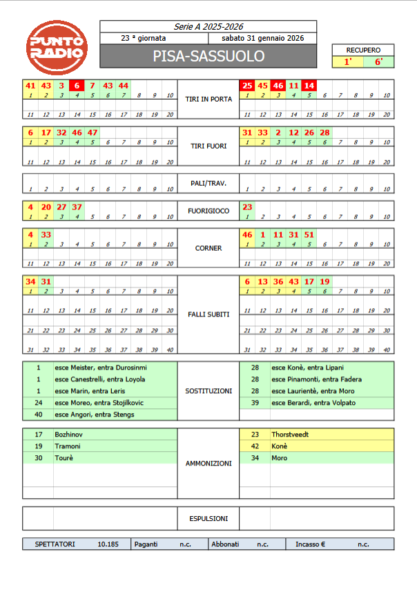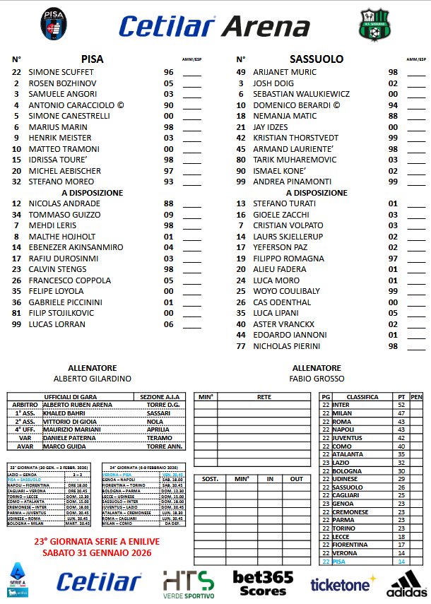 Buonasera, tutto pronto per Pisa-Sassuolo, match valido per la 23a giornata di serie A. Squadre in campo, Pisa in maglia nerazzurra e che attaccherà sotto la Curva Sud. Partiti! Angolo Pisa al 4': da destra vanno Tramoni e Angori. Batte Tramoni al 4' e sul proseguo gooolll Pisa, annullato per fuorigioco. Controllo Var in corso. Annullato, per posizione irregolare di Bozhinov sull'assist di Caracciolo. Peccato. Occasione Pisa al 7': Aebischer, di destro a giro, mette sul fondo di poco. Molto bene i nerazzurri in questo inizio di gara. Pressione continua e pericolosità. Siamo all'8'. Pisa pericoloso al 13' direttamente da fallo laterale avanzato di Canestrelli, tocca di testa Touré e Moreo arriva in ritardo di un soffio. Match bloccato, molto giocato, resta una leggera prevalenza Pisa. Siamo al 16'. Occasione Sassuolo al 16': Laurienté va via a sinistra, arriva sul fondo e trova la risposta con i piedi di Scuffet sul primo palo. Ci prova ancora il Pisa, questa volta da fuori, con Tramoni: destro sul primo palo sul fondo al 17'. Raggiunto e superato anche il 20', persiste l'equilibrio. Ammonito Thorstvedt per proteste al 24'. Gol Sassuolo. Occasione Pisa al 25': Meister si fa anticipare dal difensore sotto porta sull'assist al bacio di Tramoni da sinistra, riparte il Sassuolo e Berardi fissa l'1 a 0. Gol sul primo palo potente, Scuffet non impeccabile. Come spesso accaduto in questa stagione, Pisa colpito alla prima occasione utile. Incredibile. Riparte il match. Siamo al 29'. Occasione Sassuolo al 31': ancora Berardi, pescato da sinistra, conclusione al volo incrociata sul secondo palo sul fondo. Nerazzurri scossi dal gol subito e ora ospiti padroni del campo. Al 33' ancora Berardi, destro da fuori area a lato. Bene in erazzurri negli ultimi minuti. Siamo al 41'. Poco prima Moreo pericoloso sotto porta. Ammonito Koné al 42' per gioco pericoloso su Marin. Occasionissima Sassuolo al 45': Scuffet si supera su Koné sotto porta, palla in angolo. Gol Sassuolo al 46': Berardi calcia sul proseguo dell'angolo da sinistra e tocca Caracciolo in porta per 2-0. Finisce così, dopo 2 minuti di recupero, squadre al riposo sul 2 a 0.