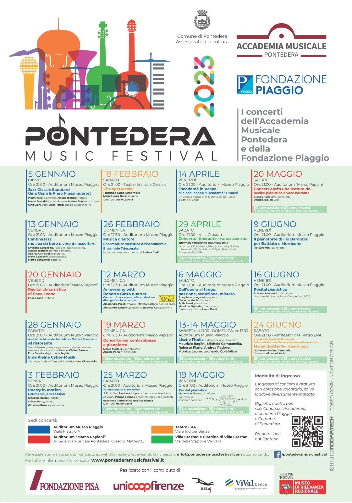 Un fittissimo cartellone di 19 appuntamenti che, da Gennaio a Giugno, animeranno le consuete sedi ove il festival realizza i concerti, sfruttando le peculiari caratteristiche acustiche e architettoniche delle location: l’Auditorium del Museo Piaggio, l’Auditorium “Marco Papiani” dell’Accademia Musicale Pontedera, nella sua nuova sede nei locali ristrutturati dell’ex-Cinema Roma, il Teatro ERA e Villa Crastan.