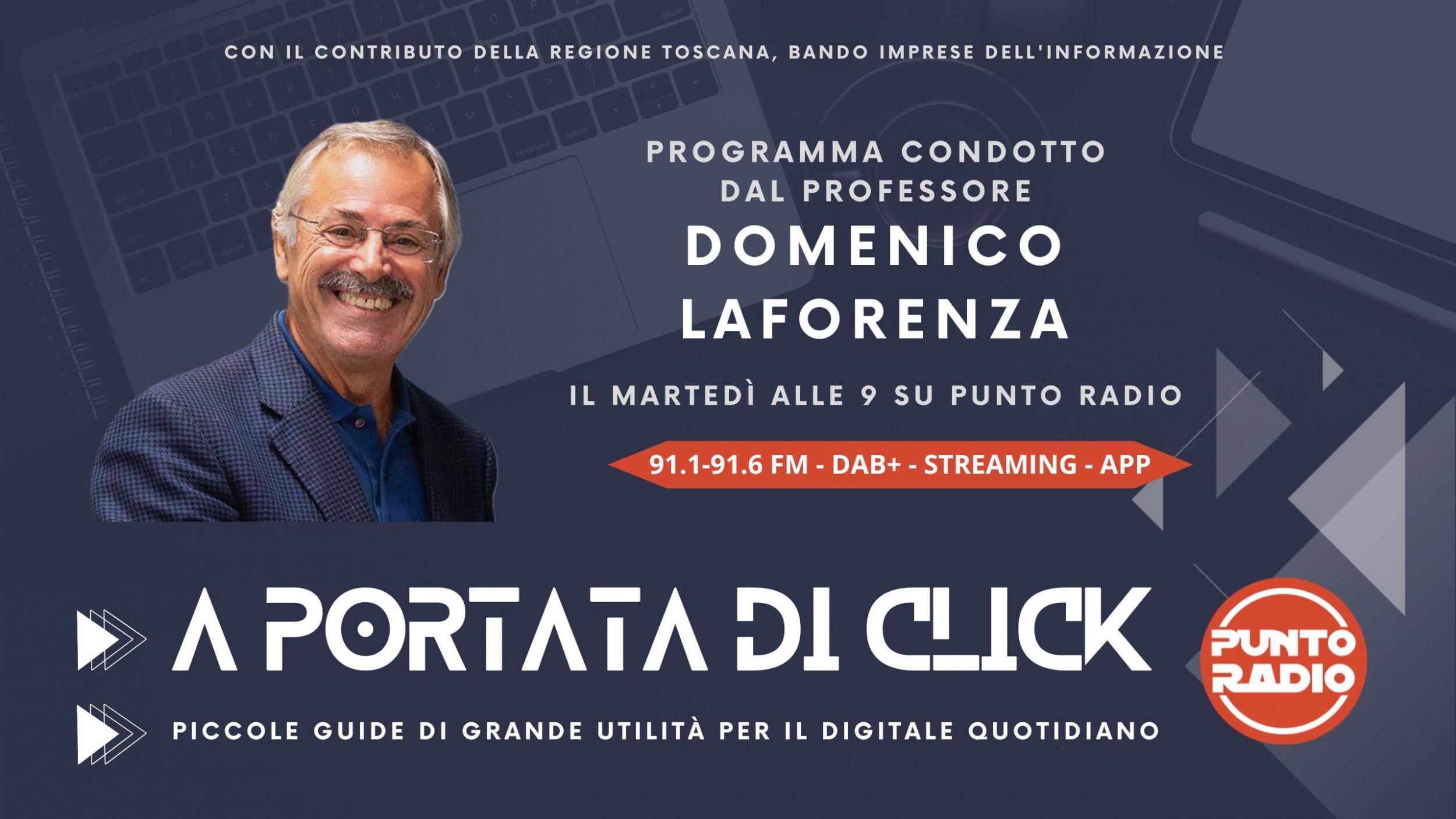 Martedì 21 aprile torna "A portata di Click - Piccole guide di grande utilità per il digitale quotidiano", il programma realizzato da Punto Radio con il contributo della Regione Toscana, condotto in studio dal professore Domenico Laforenza.