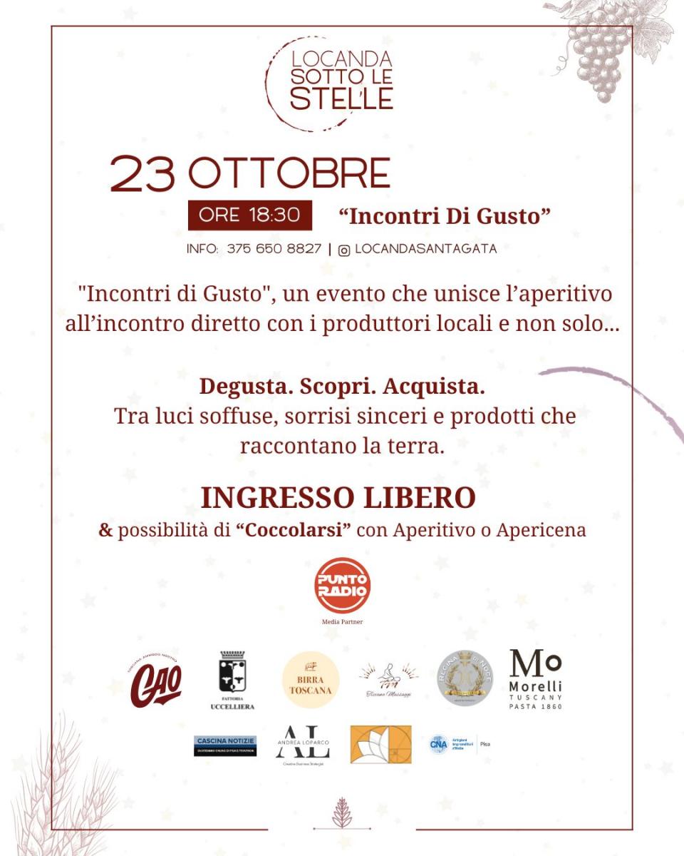 Giovedì 16 ottobre Punto Radio dedica uno speciale al gusto e alla cultura enogastronomica nel territorio pisano e alla seconda edizione di Incontri di gusto, l'evento in programma giovedì 23 ottobre presso la Locanda Sant'Agata di San Giuliano Terme.