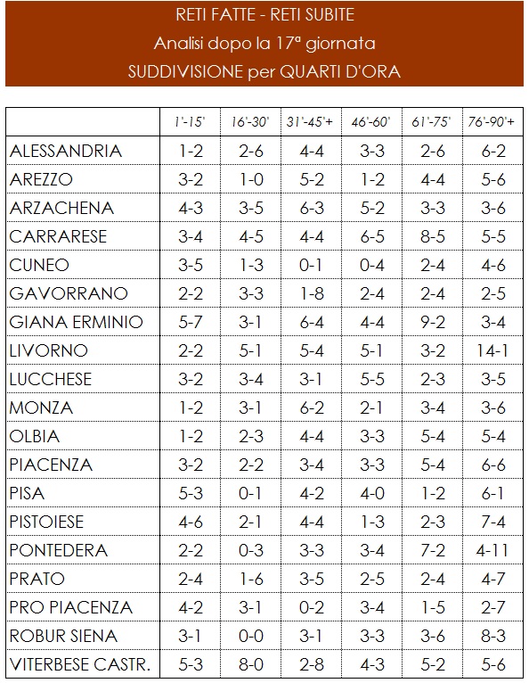 Altalenante la performance della Viterbese: dal 16' al 45': nella fase centrale del primo tempo (dal 16’ al 30’) ha realizzato 8 reti e non ne ha subita nessuna, nel quarto d'ora successivo (dal 31' al 45') ha invece uno score oltremodo deficitario, 2 sole reti fatte ed 8 reti subite. Il Cuneo nella mezz'ora centrale (dal 31' al 60') non ha realizzato nemmeno 1 gol e ne ha invece subiti 5. Continua infine la situazione veramente strana della Robur Siena che, nella parte centrale del primo tempo (dal 16’ al 30’), è come se non avesse nemmeno giocato, zero reti fatte e zero reti subite.