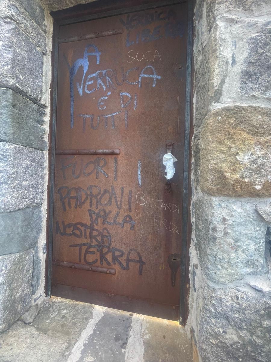 Ignoti hanno tentato di forzare e manomettere la serratura, introducendo materiali all’interno del meccanismo per impedirne l’utilizzo; la maniglia è stata imbrattata con sostanze organiche (escrementi) e la porta deturpata con scritte offensive e volgari: “Suca” e “Bastardi di merda”.