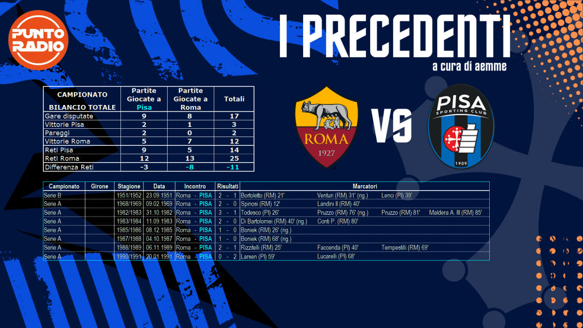 Meno sette. È molto triste ma siamo qui a fare il conto alla rovescia che ponga fine ad una stagione che non ha voluto saperne di raddrizzarsi. Il Pisa scende nella capitale per la prima di due partite che disputerà in questo scorcio finale di stagione e controla Roma, che certo non stra attraversando un periodo propriamente felice, proverà ad invertire la tendenza e spezzare a due la serie di risultati negati che sono seguiti la vittoria contro il Cagliari.