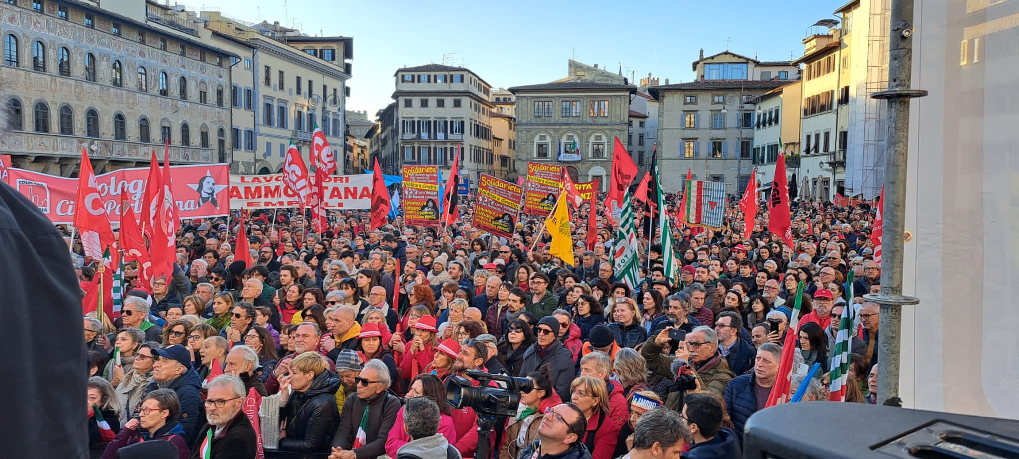 Il corteo di Firenze, partito da piazza Santa Maria Novella, ha visto le conclusioni in una strapiena piazza Poggi (a migliaia non sono riusciti a entrare), dove sono intervenuti dal palco Rossano Rossi (segretario generale Cgil Toscana), lavoratori, lavoratrici, pensionate/i, Ivana Veronesi (segreteria Uil nazionale). Erano in piazza i massimi esponenti delle istituzioni regionali e cittadine e della politica regionale.