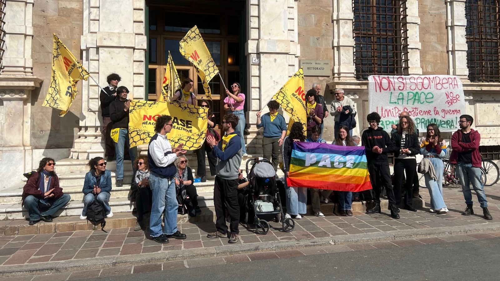 In foto il presidio No Base davanti al Rettorato Unipi.