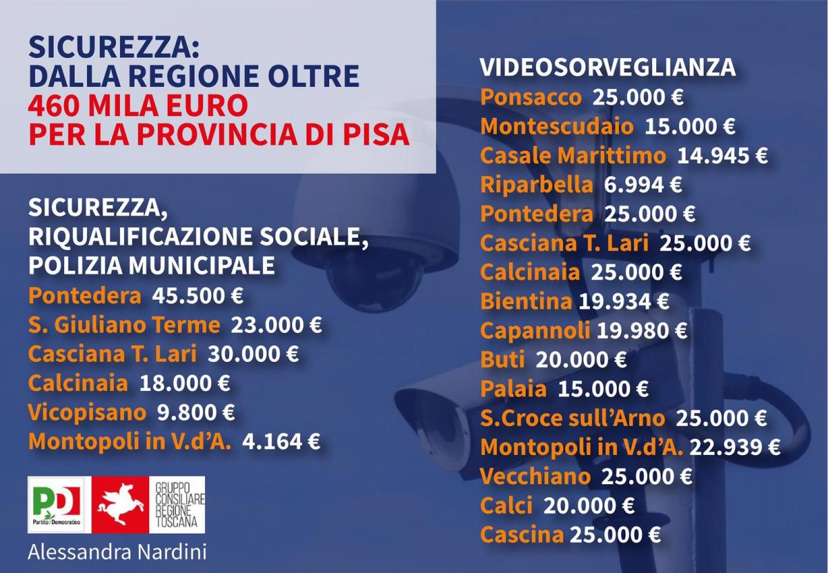 "La Regione stanzia quasi 4 milioni di euro per rigenerazione sociale dal basso, sicurezza, videosorveglianza. Molte sono anche le risorse che arriveranno per i Comuni in Provincia di Pisa che si sono aggiudicati il bando.