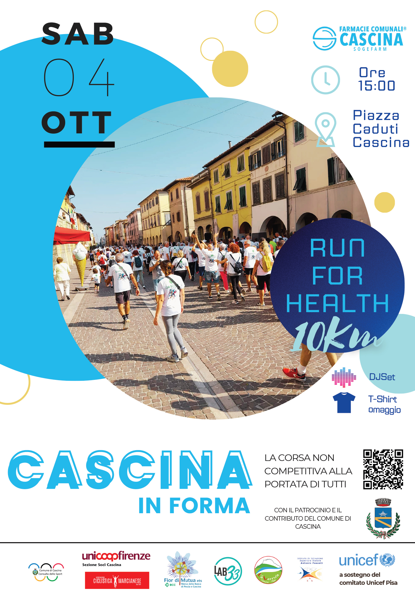 Sabato 4 ottobre 2025 torna CASCINA IN-FORMA RUN FOR HEALTH, organizzato da Sogefarm - Farmacie Comunali di Cascina, la corsa non competitiva che dal centro storico si snoderà sul territorio cascinese