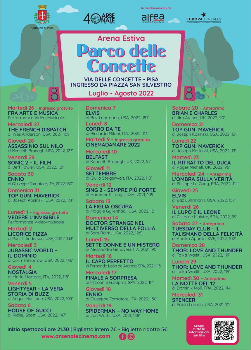 Tutte le sere a partire dalle 21.30, su uno schermo gigante da 16 metri con proiezioni in 4K, si alterneranno i grandi successi della stagione, come “Top Gun: Maverick”, “Elvis” ed “House of Gucci”, il cinema d'animazione per i più piccoli come “Sing 2” e “Lightyear – La vera storia di Buzz”, i film italiani come “Corro da te” ed “Ennio” e tanto altro ancora.