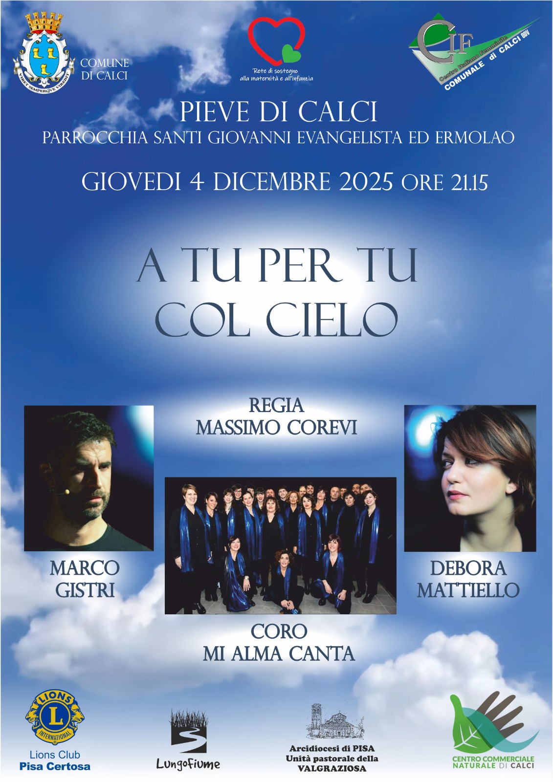 Parole, musica e canto. Un filo diretto dell’uomo con il cielo, un dialogo interiore, fatto di domande, che diventa una preghiera verso l’alto, verso il luogo dove giungono le speranze e le paure umane: sul palco un uomo e una donna e una serie di domande a cui ognuno dei presenti potrà dare la propria risposta. Uno spettacolo - emozionante e vibrante - che arriva nella pieve di Calci dopo aver toccato le corde più intime degli spettatori nella Pieve di San Casciano, nella Basilica di San Piero a Grado e nella chiesa di Ponsacco.