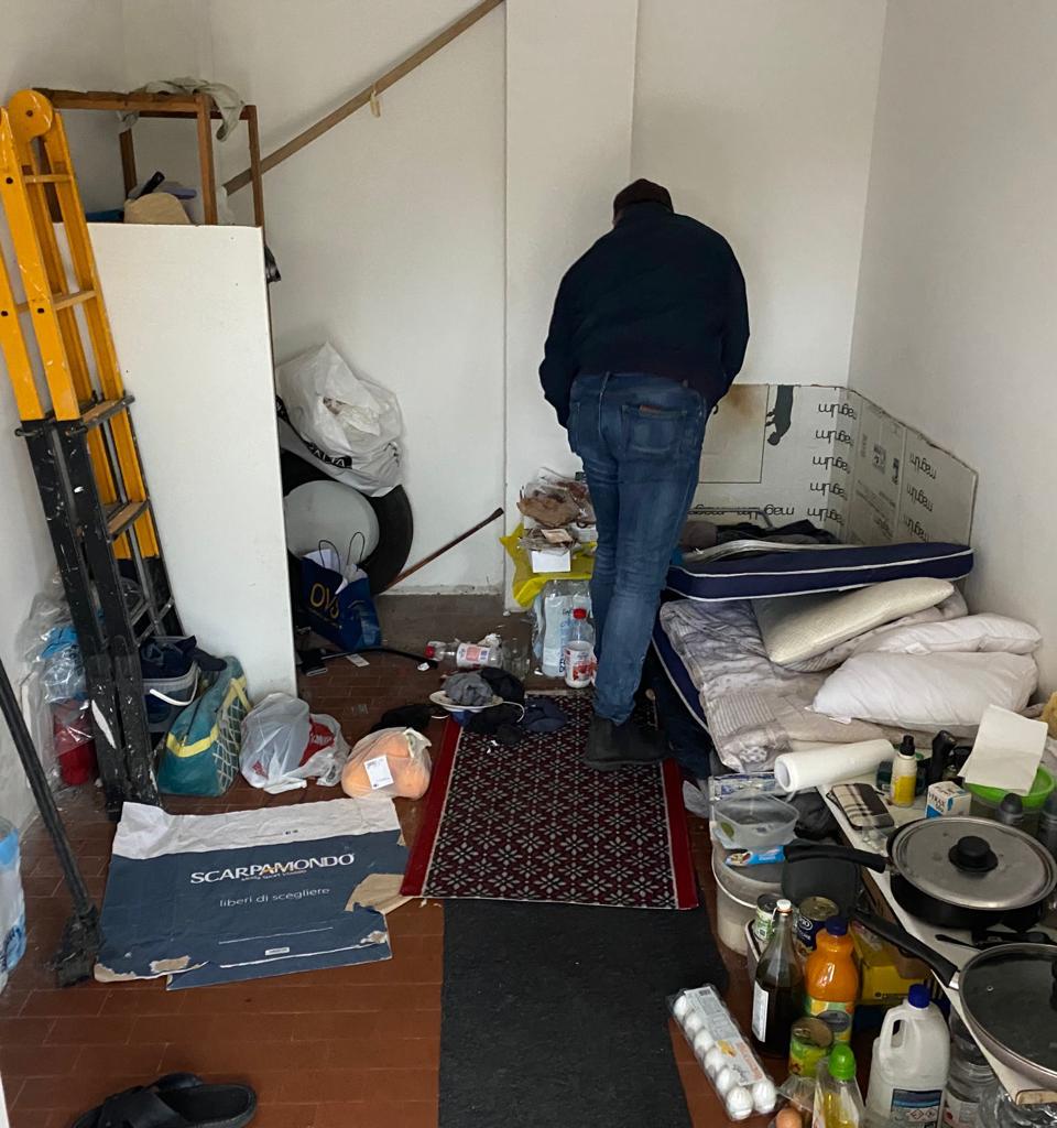Il Nosu lo sgombera. Infatti una coppia di anziani coniugi si era presentata in ufficio per sporgere denuncia contro un uomo di nazionalità tunisina che, con un pretesto, si era installato in un garage di un condominio di Cisanello, dapprima utilizzandolo come ricovero di materiali e poi trasformandolo in una vera e propria dimora con tanto di letto, materasso, lenzuola, abiti, derrate alimentari e fornello con bombola di gas.