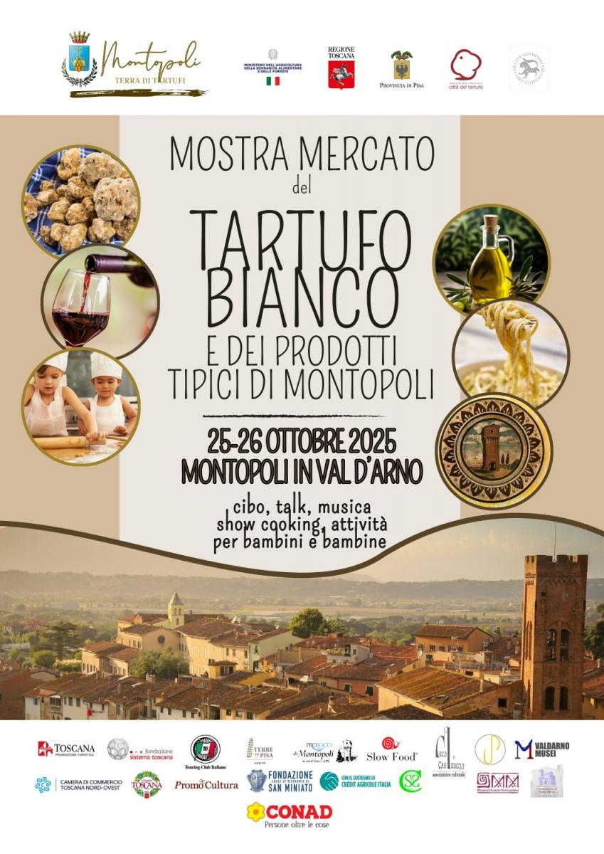 Nelle prossime ore il borgo di Montopoli si animerà di stand e banchi dove poter gustare i sapori enogastronomici del territorio: dal vino all'olio, passando dalla pasta, i salumi, i formaggi, il miele, il cioccolato e poi, ovviamente, il tartufo bianco.