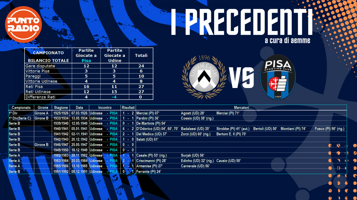 A dirigere la gara è stato scelto Giovanni Ayroldi di Molfetta. Ad assisterlo ci saranno Marcello Rossi di Biella e Andrea Zezza di Ostia Lido. Quarto assistente Kevin Bonacina di Bergamo. In sala Var ci sarà Giacomo Camplone di Pescara, coadiuvato da Michael Fabbri di Ravenna. Il fischietto pugliese ha diretto il Pisa nove volte con il bilancio di tre vittorie un pareggio e cinque sconfitte. |