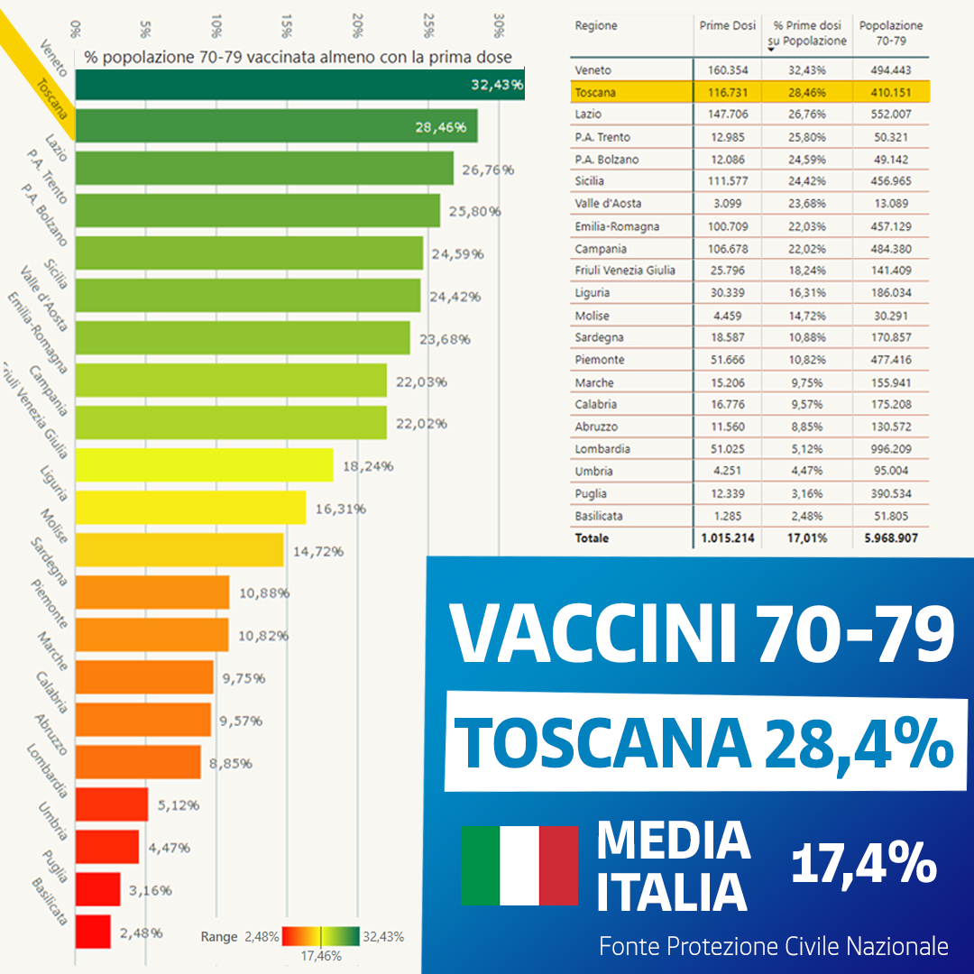 Dati alla mano - la fonte citata è la Protezione Civile - il presidente della Regione scrive: "La Toscana è tra le regioni che hanno somministrato più vaccini con AstraZeneca alla fascia di età 70-79" (Toscana seconda regione dopo il Veneto per questa fascia di età con la somministrazione di almeno una dose di vaccino al 28,46% dei destinatari ndr).