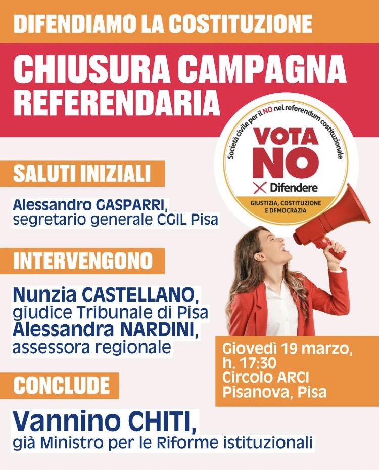 La mobilitazione proseguirà fino al termine della campagna referendaria e culminerà a Pisa città, nell’iniziativa conclusiva di giovedì 19 marzo, alle ore 17.30, presso il Circolo Arci Pisanova Isola Verde (via Frascani). Interverranno Alessandro Gasparri (Segretario generale Cgil Pisa), Nunzia Castellano (Giudice del Tribunale di Pisa) e Alessandra Nardini (Assessora Regione Toscana). Concluderà Vannino Chiti, già ministro per le Riforme istituzionali.