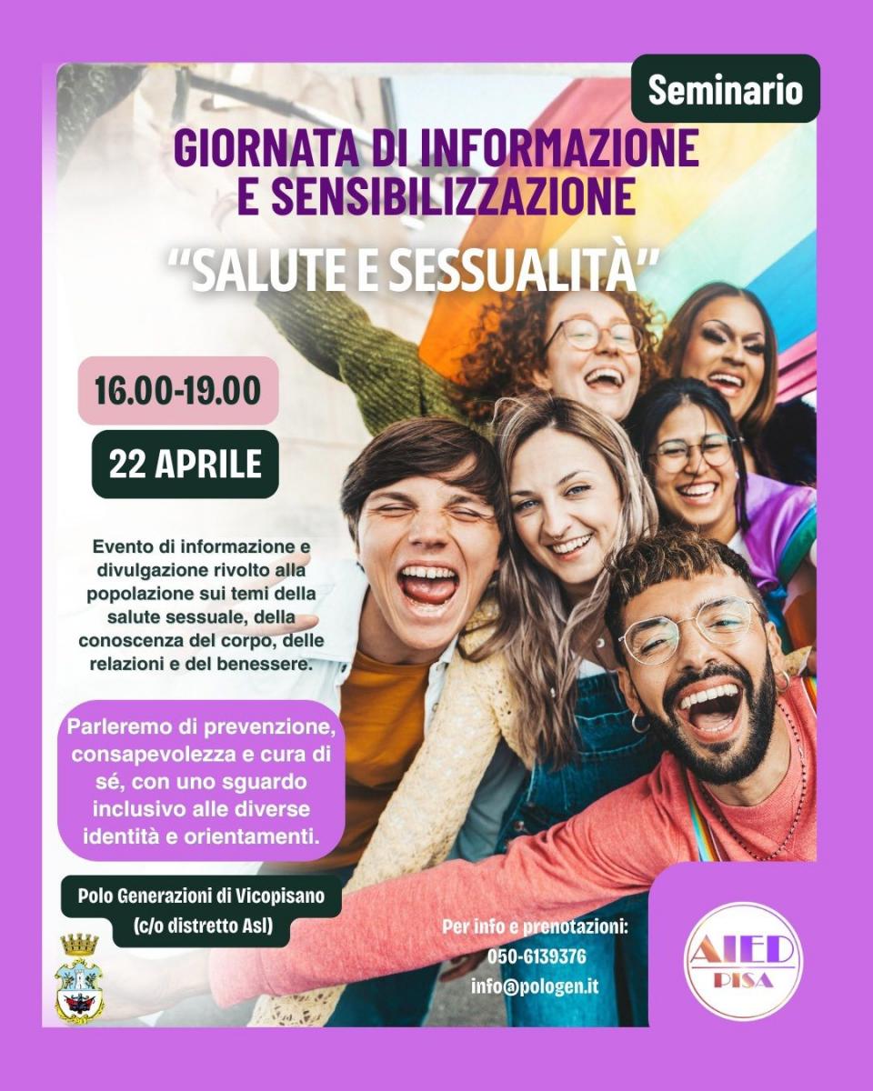 Il Comune di Vicopisano presenta il seminario “Salute e sessualità”, in programma martedì 22 aprile, dalle 16:00 alle 19:00, al Polo Generazioni di Vicopisano, nel distretto socio-sanitario Asl di via dei Mezzi. Partecipazione libera e gratuita (ma è gradita la prenotazione).