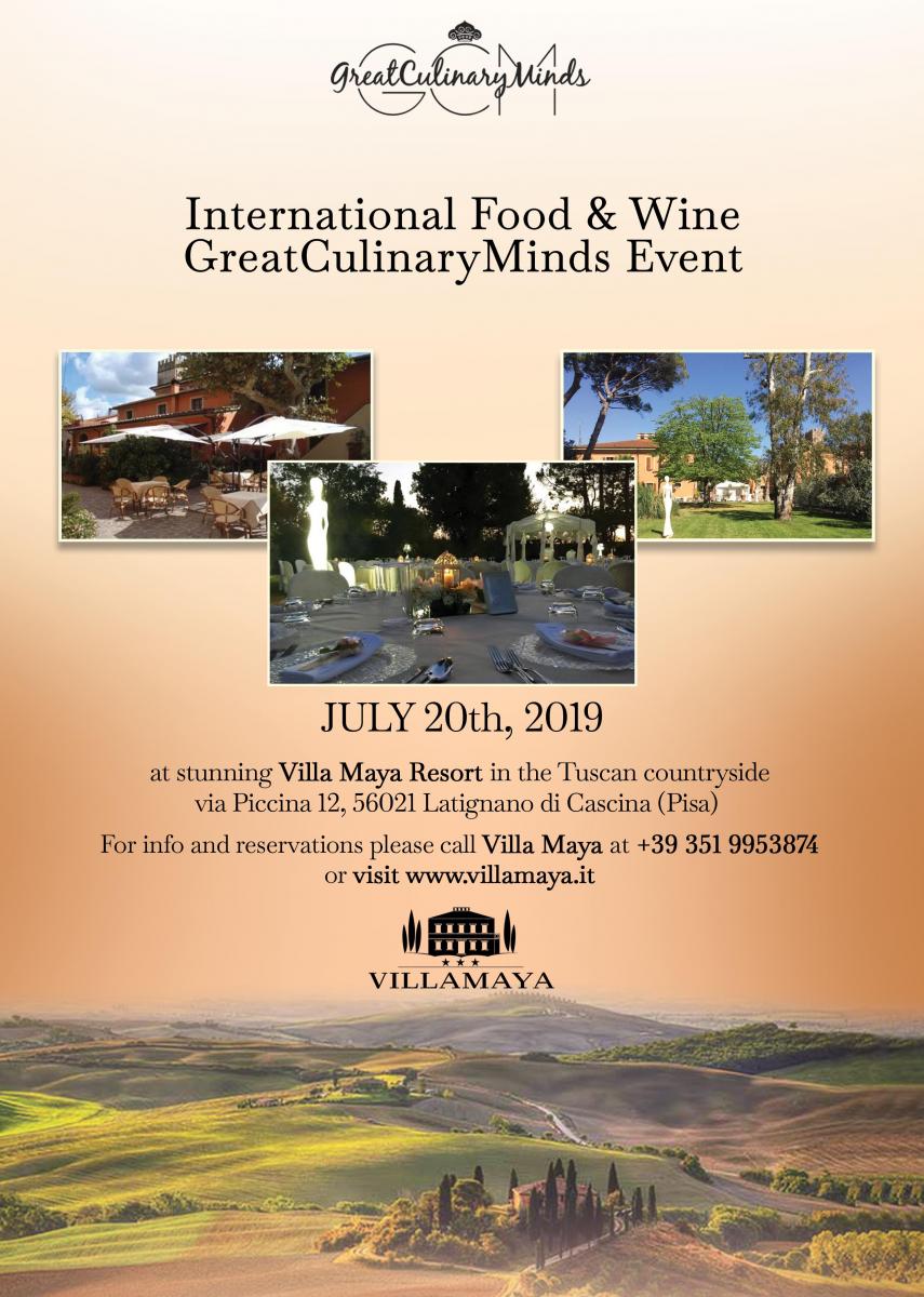 Prendi una fattoria toscana immersa in un parco di 25.000 mq, aggiungi un gruppo di chef di eccezione ed ecco che si ottiene "A night of culinary magic in Tuscany" un evento che andrà in scena il 20 luglio a Villa Maya a Latignano di Cascina grazie a Great Culinary Minds, fondata nel 2013 da Ursula Avella come azienda di marketing enogastronomico e brand building per il settore con famosi eventi a New York, Los Angeles, San Francisco, Miami, ed il patrocinio di Confesercenti Toscana Nord.